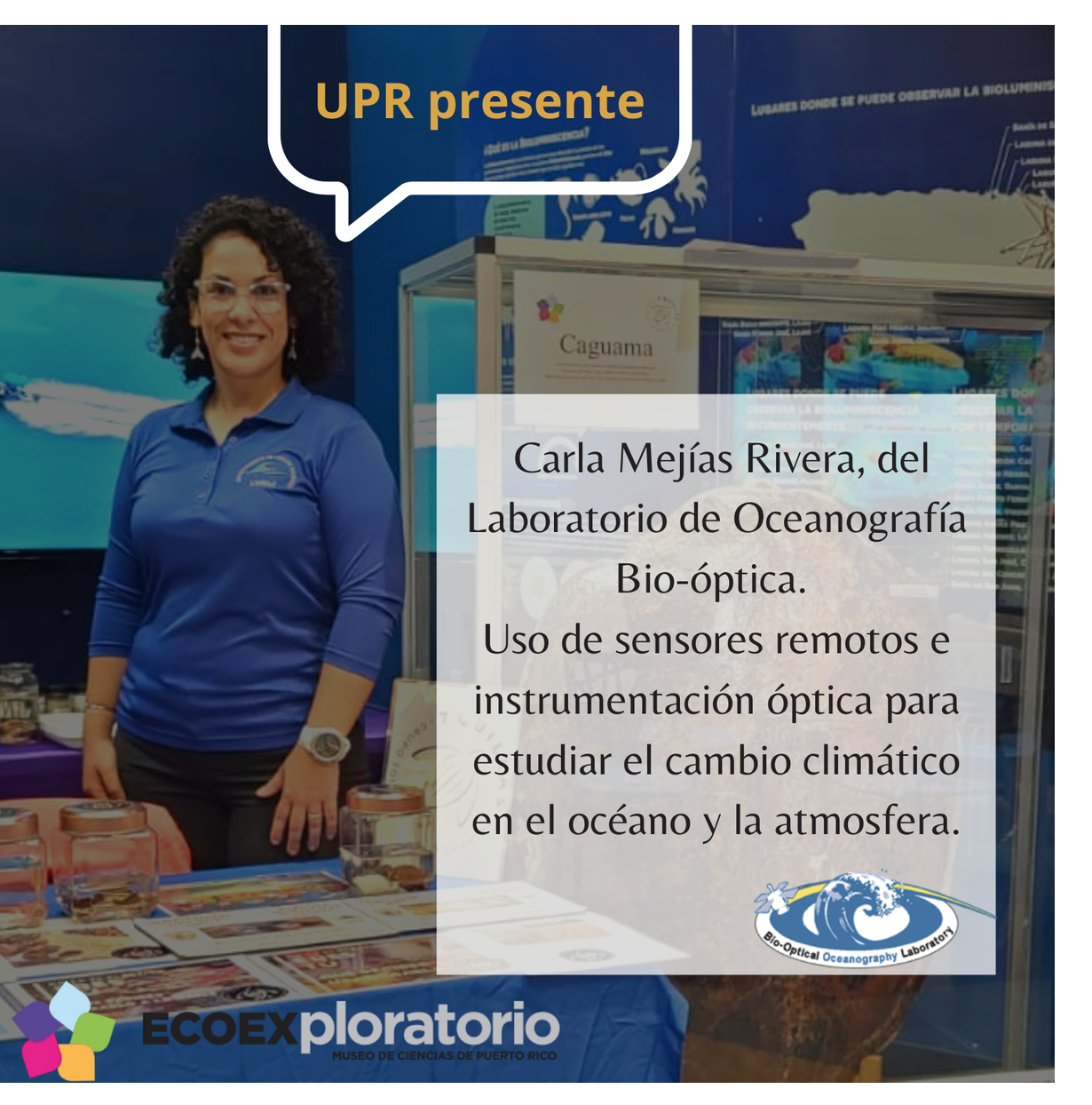 La estudiante doctoral Carla Mejías Rivera del Departamento de Ciencias Marinas de la Universidad de Puerto Rico en Mayagüez, representó al grupo de investigación del Dr. Roy Armstrong en el evento. Allí compartió desde una mesa informativa su conocimiento y enseñó a los participantes sobre uso de sensores remotos e instrumentación óptica, para estudiar el cambio climático en el océano y la atmósfera.
