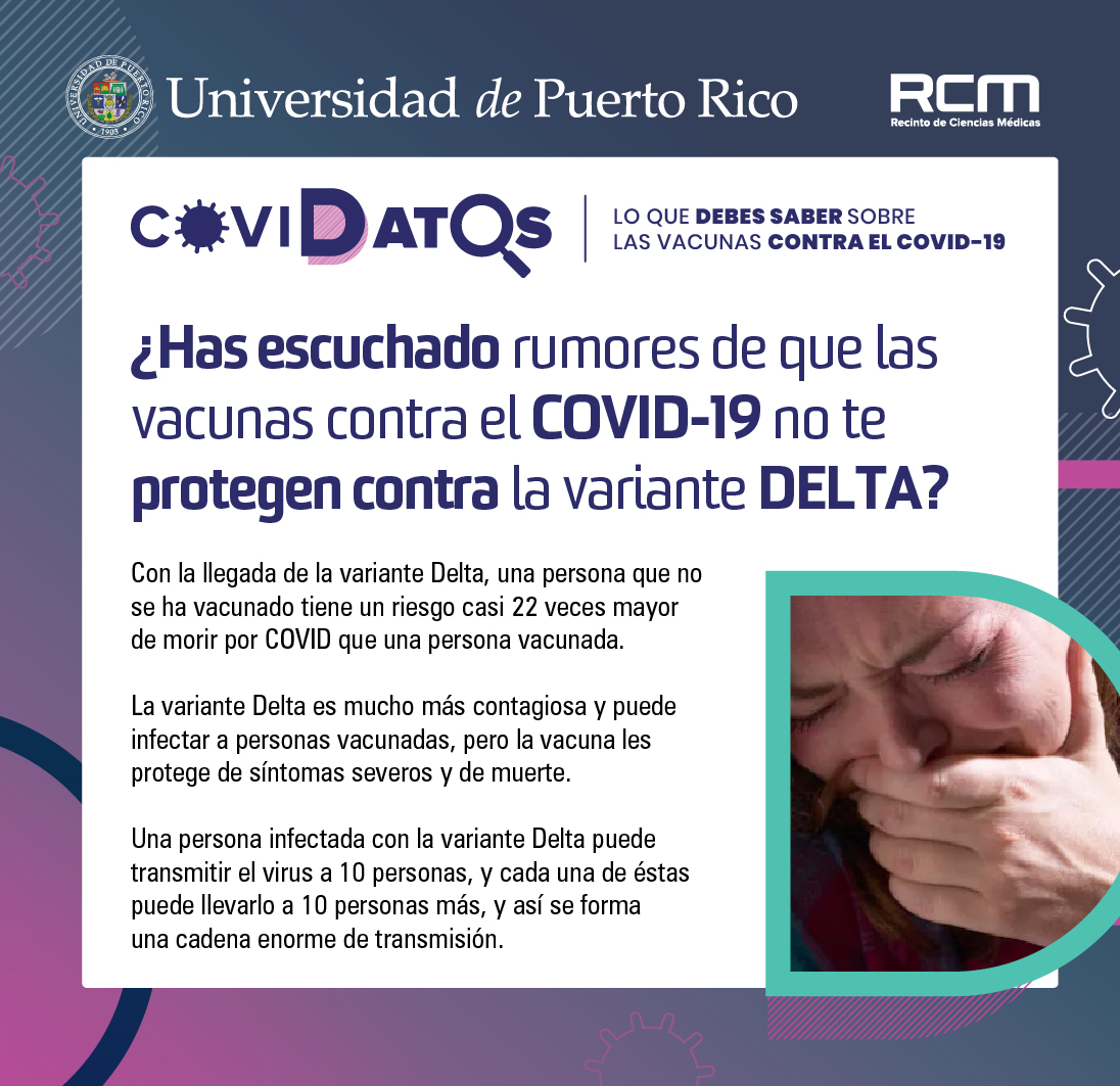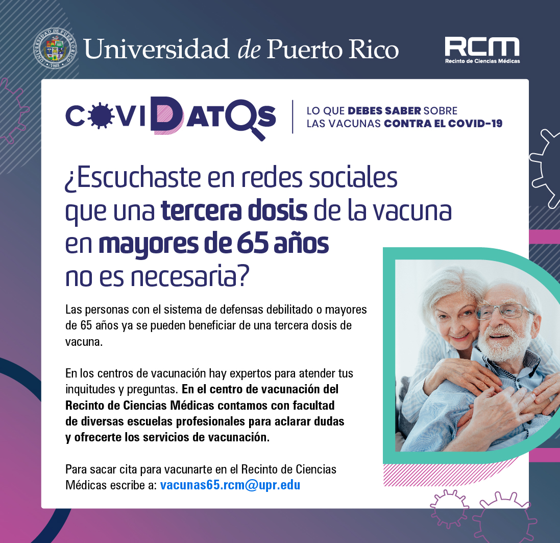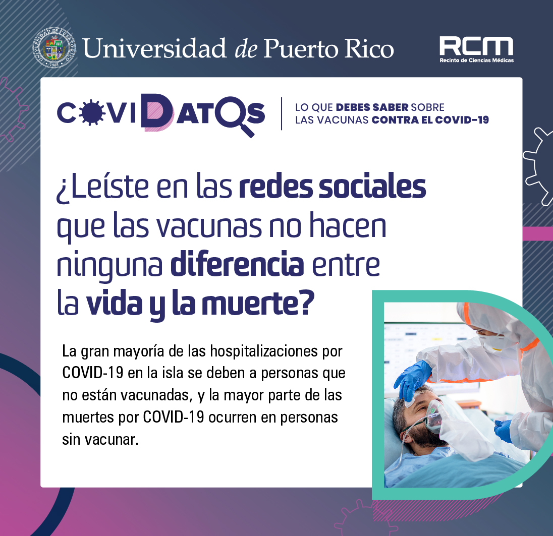 “Como principal centro de formación de la futura generación de profesionales de la salud, en el Recinto de Ciencias Médicas tenemos un compromiso con la educación, el servicio y la investigación. Para nosotros es vital que la comunidad conozca lo que se investiga y estudia en el Recinto porque somos una fuente confiable de información que vigila por la salud y el bienestar de la ciudadanía. Esta campaña tiene como prioridad salvar vidas a través de la prevención de la propagación del COVID-19 y para esto la vacunación es determinante. También es esencial mantener las medidas de lavado de manos, uso de la mascarilla y distanciamiento social”, afirmó la académica, al tiempo que exhortó a la ciudadanía a conocer la campaña visitando upr.edu/ac.