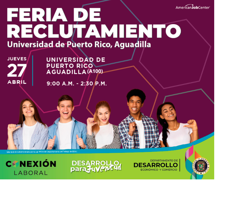 26 de abril de 2023 (Aguadilla, PR) – El Programa de Desarrollo de la Juventud (PDJ), parte integral del Departamento de Desarrollo Económico y Comercio (DDEC) y en colaboración con la Universidad de Puerto Rico en Aguadilla anuncian su Feria de Reclutamiento que se llevará a cabo mañana jueves, 27 de abril de 9:00 a.m. a 2:30 p.m. en el Anfiteatro A100 de dicha institución.