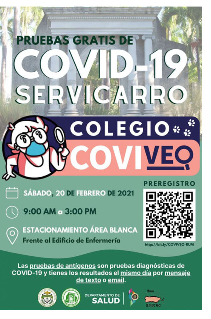 El Recinto Universitario de Mayagüez (RUM), de la Universidad de Puerto Rico (UPR), ya está listo para recibir mañana sábado, 20 de febrero de 2021, el Proyecto COVIveo, que contará con unas 2,160 pruebas de antígeno de detección de COVID-19, abierto tanto para la comunidad universitaria como para el público en general.