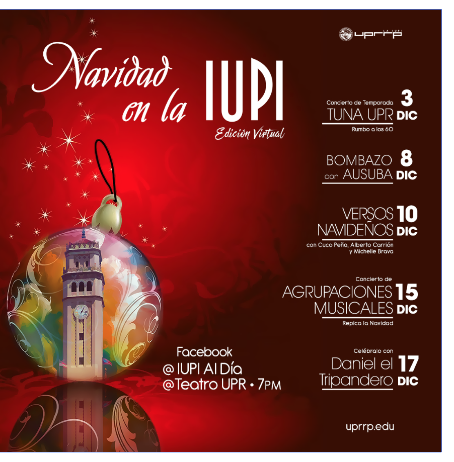 Disfruta los eventos de Navidad en la IUPI cada fecha a las 7:00 p. m. en las redes sociales UPR RP, Teatro UPR y IUPI al Día en Facebook.