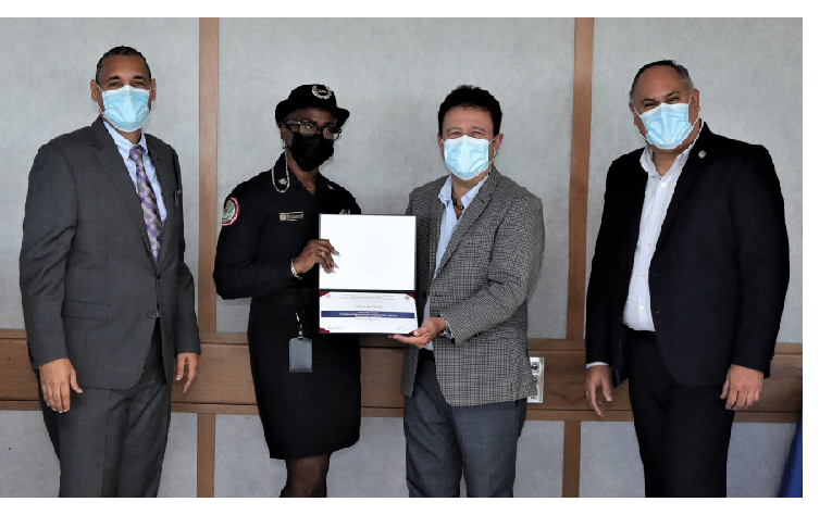 Entrega certificados policia municipal de Carolina. En la foto: rector UPR Carolina, Dr. José I. Meza Pereira, agente municipal, Hon. José Aponte, alcalde de Carolina y el Profesor Miguel Perez, Director DECEP.