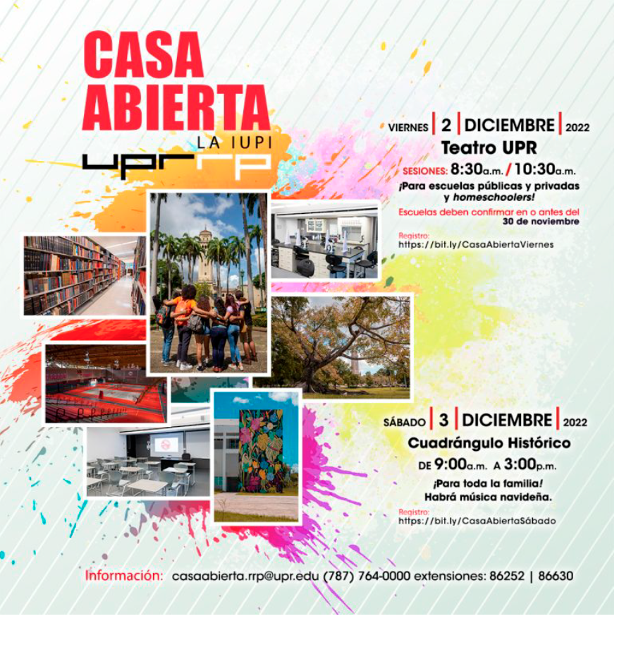 Para más información puede escribir un correo electrónico a casaabierta.rrp@upr.edu/ac o llamar al 787-764-0000 extensiones 86252 o 86630.