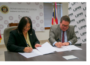 El acuerdo, suscrito por la presidenta interina de la Universidad de Puerto Rico (UPR), doctora Mayra Olavarría Cruz, y el secretario de Justicia, Domingo Emanuelli Hernández, identifica y provee estudiantes para que realicen labores como ayudantes técnicos en un Programa de Internado en el Registro de la Propiedad, dependencia del Departamento de Justicia.