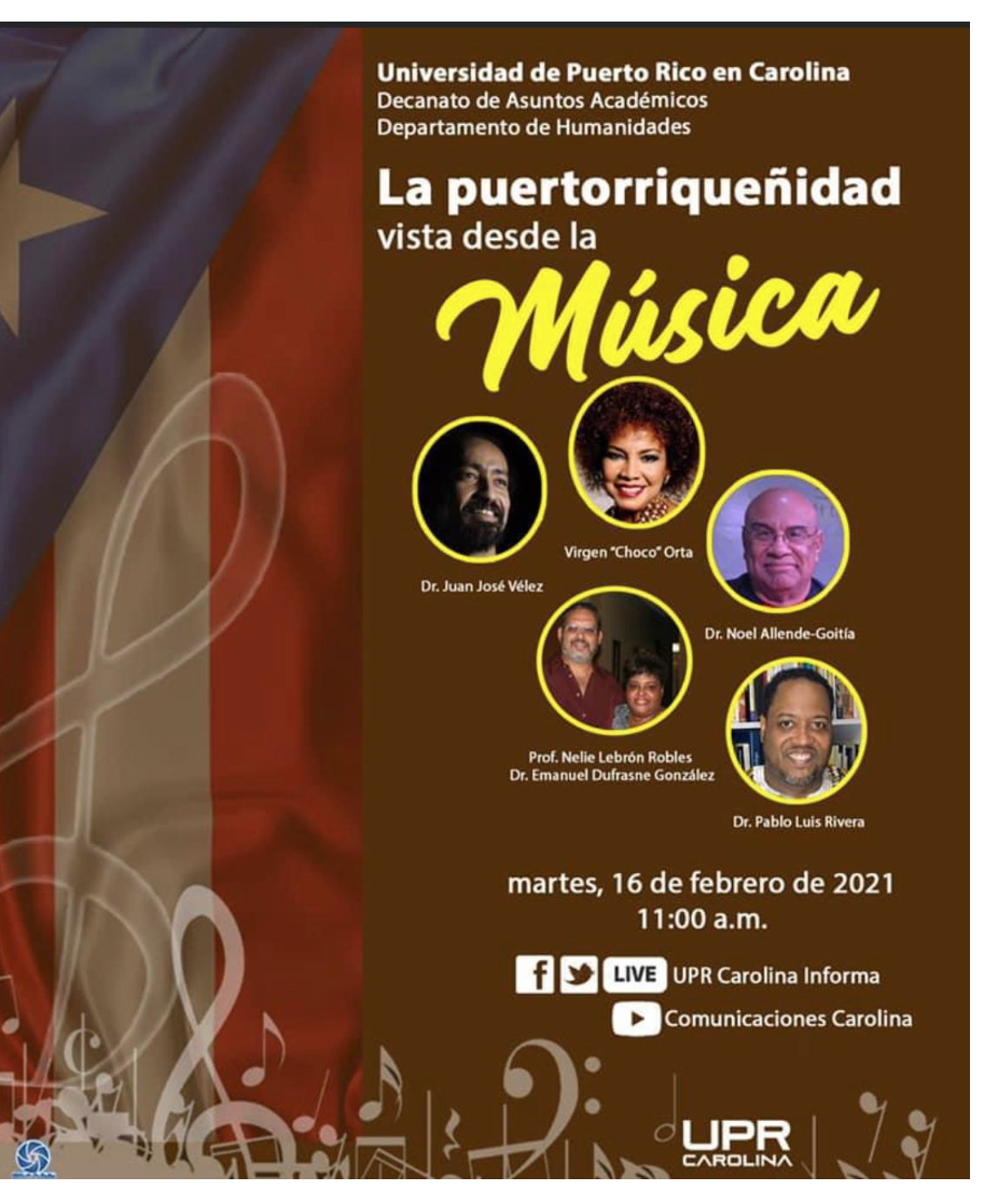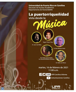 Carolina, Puerto Rico– El Decanato de Asuntos Académicos junto al Departamento de Humanidades de la Universidad de Puerto Rico en Carolina llevarán a cabo de manera virtual el simposio, “La puertorriqueñidad vista desde la música”, conversatorio sobre las diversas manifestaciones de la música en nuestra sociedad.