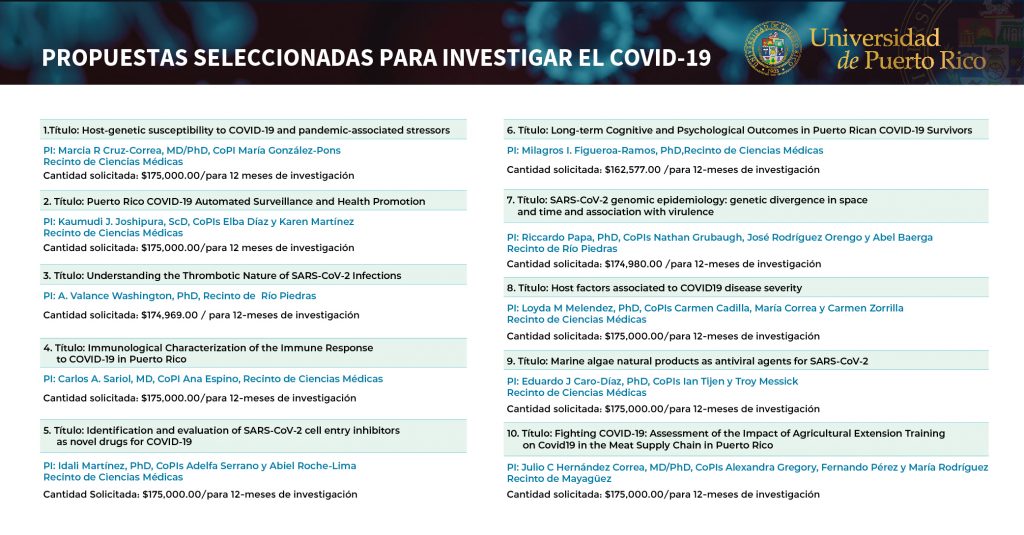 Destacados profesores de los recintos de Río Piedras, Mayagüez y Ciencias Médicas investigarán la caracterización inmunológica de la respuesta al nuevo coronavirus en Puerto Rico, la genética del paciente susceptible al COVID-19 y factores estresantes asociados a la pandemia , la identificación y evaluación de inhibidores celulares como nuevos fármacos contra el COVID-19, resultados cognitivos y psicológicos a largo plazo en el puertorriqueño sobreviviente, factores en pacientes asociados con la gravedad de la enfermedad y productos naturales como agentes antivirales, entre otros.