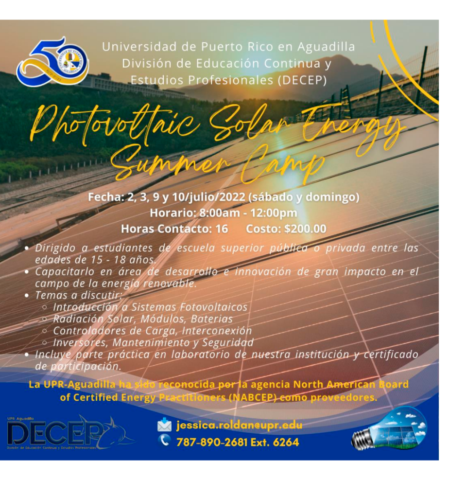 Aguadilla, P.R. – Con el enfoque de educar sobre la energía solar renovable a jóvenes de escuela superior del País, la División de Educación Continua y Estudios Profesionales (DECEP) de la Universidad de Puerto Rico en Aguadilla anuncia la apertura de las inscripciones de su campamento de verano Photovoltaic Solar Energy Summer Camp que comenzará el sábado, 2 de julio de 2022.