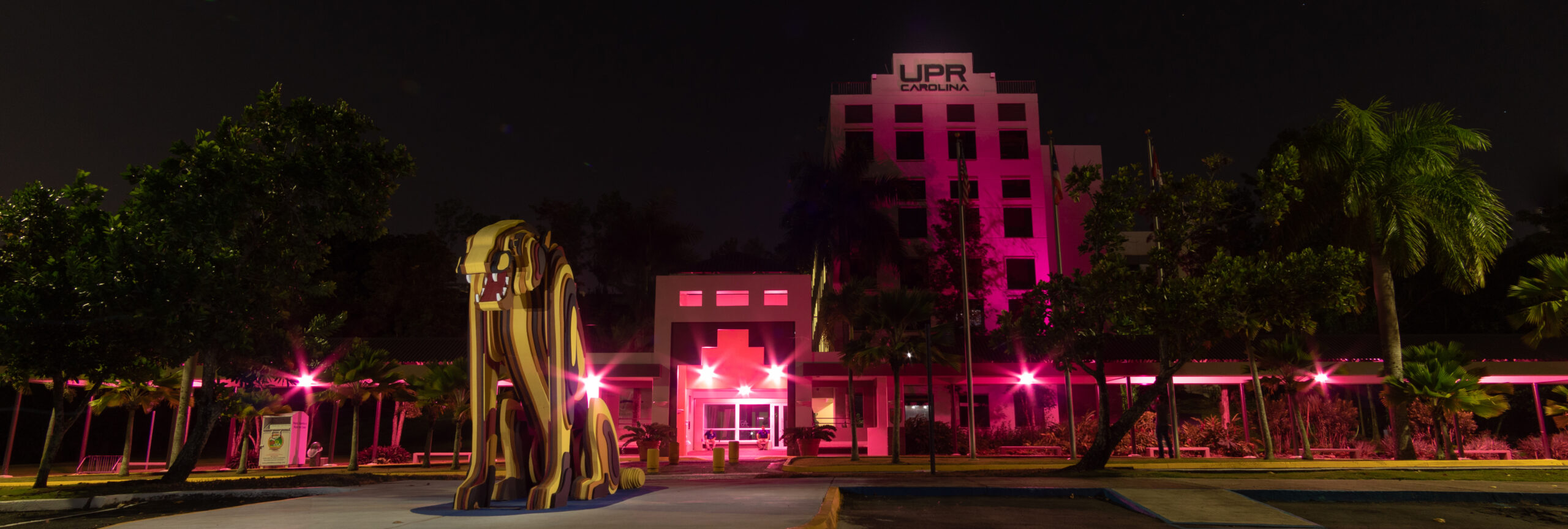 Carolina, Puerto Rico-Con el propósito crear conciencia sobre la prevención del cáncer de seno, la Universidad de Puerto Rico en Carolina realizó un encendido rosa en solidaridad y apoyo a pacientes, sobrevivientes y familiares. El vestíbulo y el edificio principal de la institución se iluminaron con luces rosadas y permanecerá encendido durante todo el mes de octubre.
