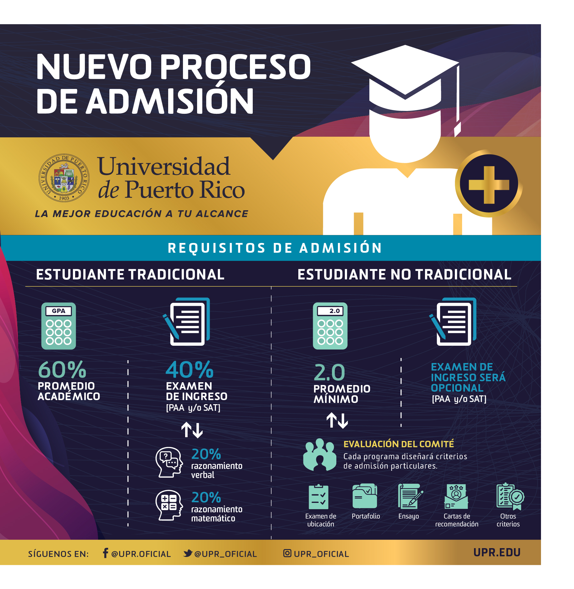 En cuanto a la admisión no tradicional, explicó que se considerará un promedio mínimo de 2.00. “La prueba del College Board, será opcional y se utilizará para fines del nivel de ubicación para las materias de español, inglés y matemáticas. Cada programa diseñará criterios de admisión particulares, tales como: examen de ubicación, portafolio, ensayo, entrevistas, cartas de recomendación y otros criterios académicos que permitan evaluar al estudiante para garantizar su acceso a la vida universitaria. Bajo esta categoría se considerarán las siguientes poblaciones, entre otras: estudiantes con talentos o habilidades especiales, estudiantes que participan del programa de articulación universitaria, población adulta, atletas, estudiantes provenientes de escuelas especializadas, estudiantes de comunidades marginadas o escasos recursos económicos y estudiantes internacionales”, especificó el Dr. Ferrao.