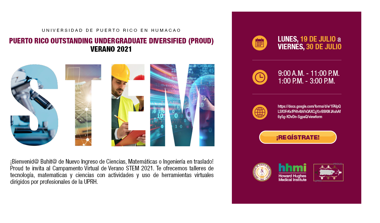 (Humacao, P.R.) – La Universidad de Puerto Rico en Humacao (UPRH) ofrecerá el Campamento Virtual de Verano STEM 2021 para estudiantes de nuevo ingreso, en las áreas de ciencia, tecnología, ingeniería y matemáticas (STEM, por sus siglas en inglés) del 19 al 30 de julio de 2021. El campamento, el cual es gratuito, es organizado por el programa Puerto Rico Outstanding Undergraduate & Diversified (PROUD-UPRH) y auspiciado por el Instituto Médico de Howard Hughes (HHMI, por sus siglas en inglés).