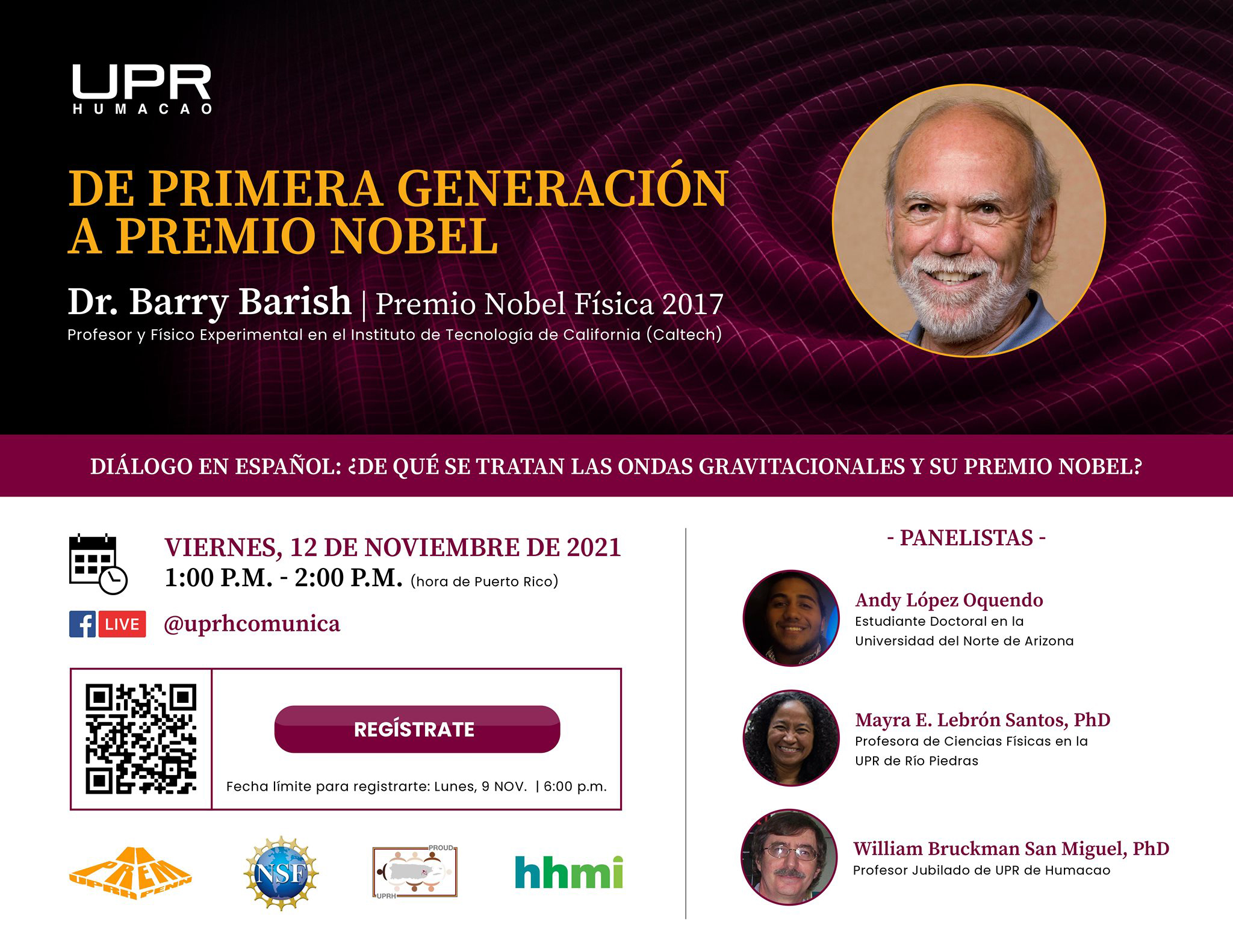 (Humacao, P.R.) – La Universidad de Puerto Rico en Humacao (UPRH) invita a toda la comunidad a participar de la conferencia De primera generación a Premio Nobel, a cargo del Dr. Barry Barish, Premio Nobel de Física 2017. La conferencia, auspiciada por los programas PREM-UPRH y PROUD-UPRH, será el viernes 12 de noviembre de 2021 a las 1:00 p.m. por Facebook Live @UPRHComunica.