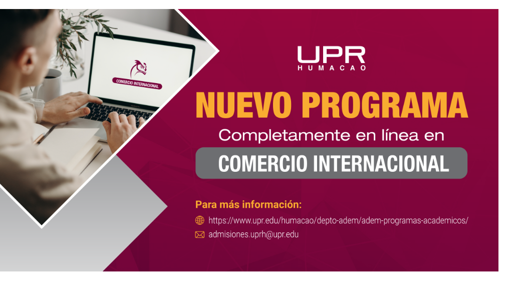(Humacao, P.R.) – A partir de agosto de 2021, la Universidad de Puerto Rico en Humacao (UPRH) y su Departamento de Administración de Empresas (Adem) ofrecerá el programa de bachillerato en Administración de Empresas con concentración en Comercio Internacional en línea. Esta iniciativa, atemperada a las circunstancias y nuevas estrategias de enseñanza/aprendizaje, amplía la oferta académica brindando mayor oportunidad a todos los estudiantes.