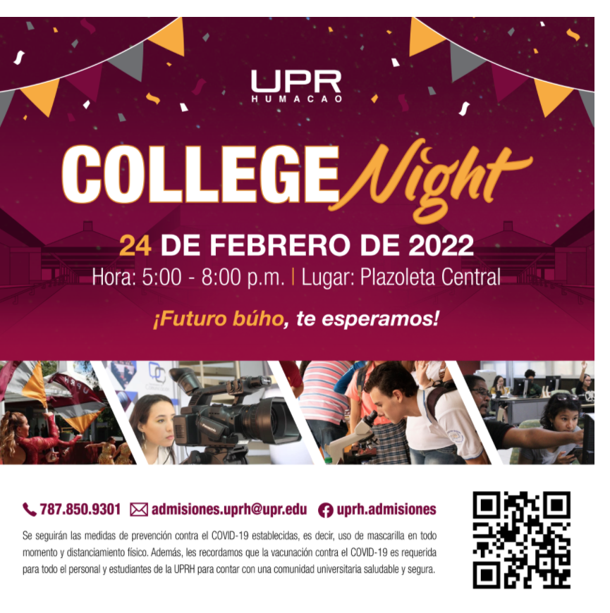 (Humacao, P.R.) – La Universidad de Puerto Rico en Humacao (UPRH) abre sus puertas para celebrar el College Night en la modalidad presencial, evento dirigido a los jóvenes de duodécimo grado interesados en solicitar admisión a la institución. La actividad será el jueves, 24 de febrero de 2022 a las 5:00 p.m. en las instalaciones de la UPRH.