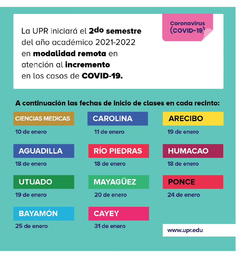En atención al incremento en los casos positivos a COVID-19 en la Isla, y tras considerar las medidas que ha tomado el Gobierno de Puerto Rico para detener la propagación de éste, con el fin de salvaguardar la salud, la seguridad y la vida de la comunidad universitaria, la Universidad de Puerto Rico (UPR) tomó la determinación de iniciar su oferta académica durante enero de 2022 en modalidad a distancia. Así lo anunció hoy la presidenta interina de esa institución, doctora Mayra Olavarría Cruz.