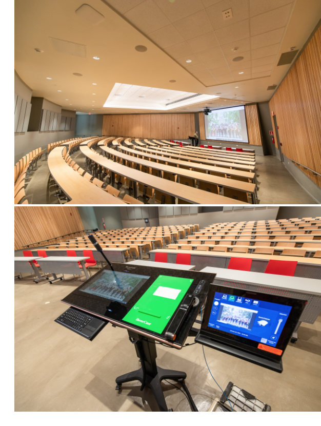 Asimismo su moderno mobiliario se observa en el podio interactivo, que integra un proyector de tiro corto- ‘short-throw’- y al mismo tiempo alberga la capacidad de conexión para internet inalámbrico y espacios para recargar equipos electrónicos. También la experiencia del público se verá mejorada con la nitidez de la acústica, los muebles que integran portales de recarga y la ventaja de proveer conexión inalámbrica a internet para todos sus usuarios, cuya sala tiene capacidad para 225 personas.