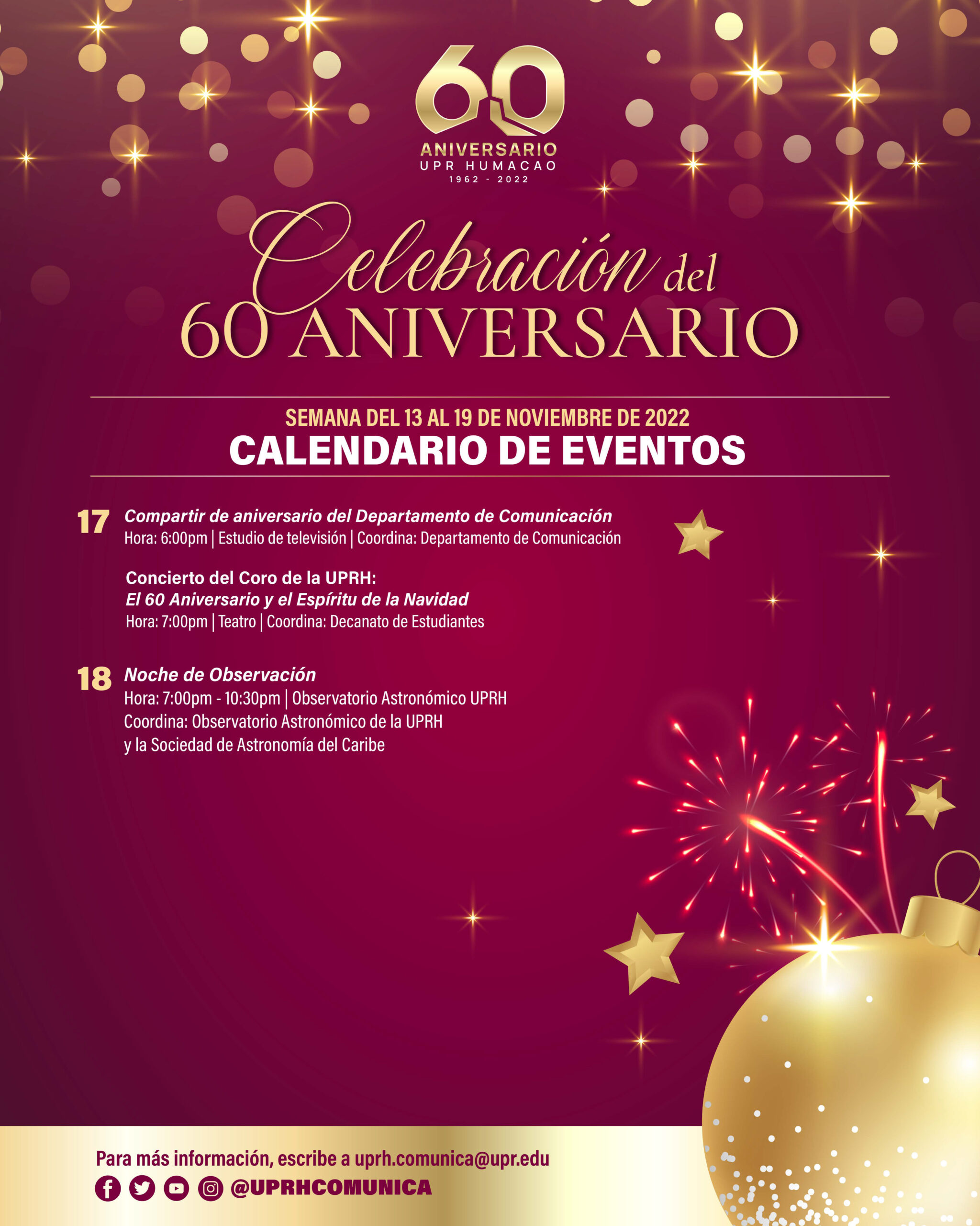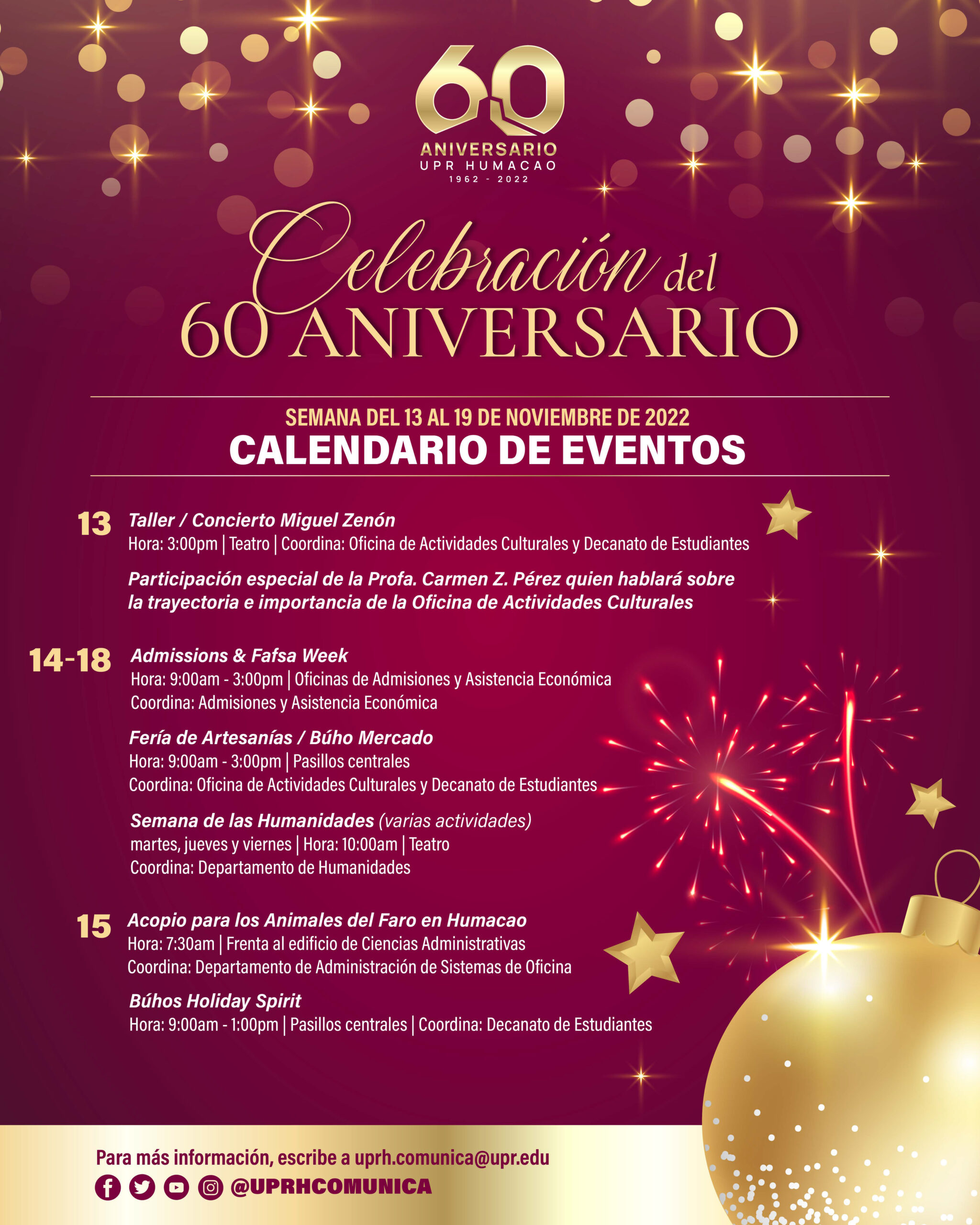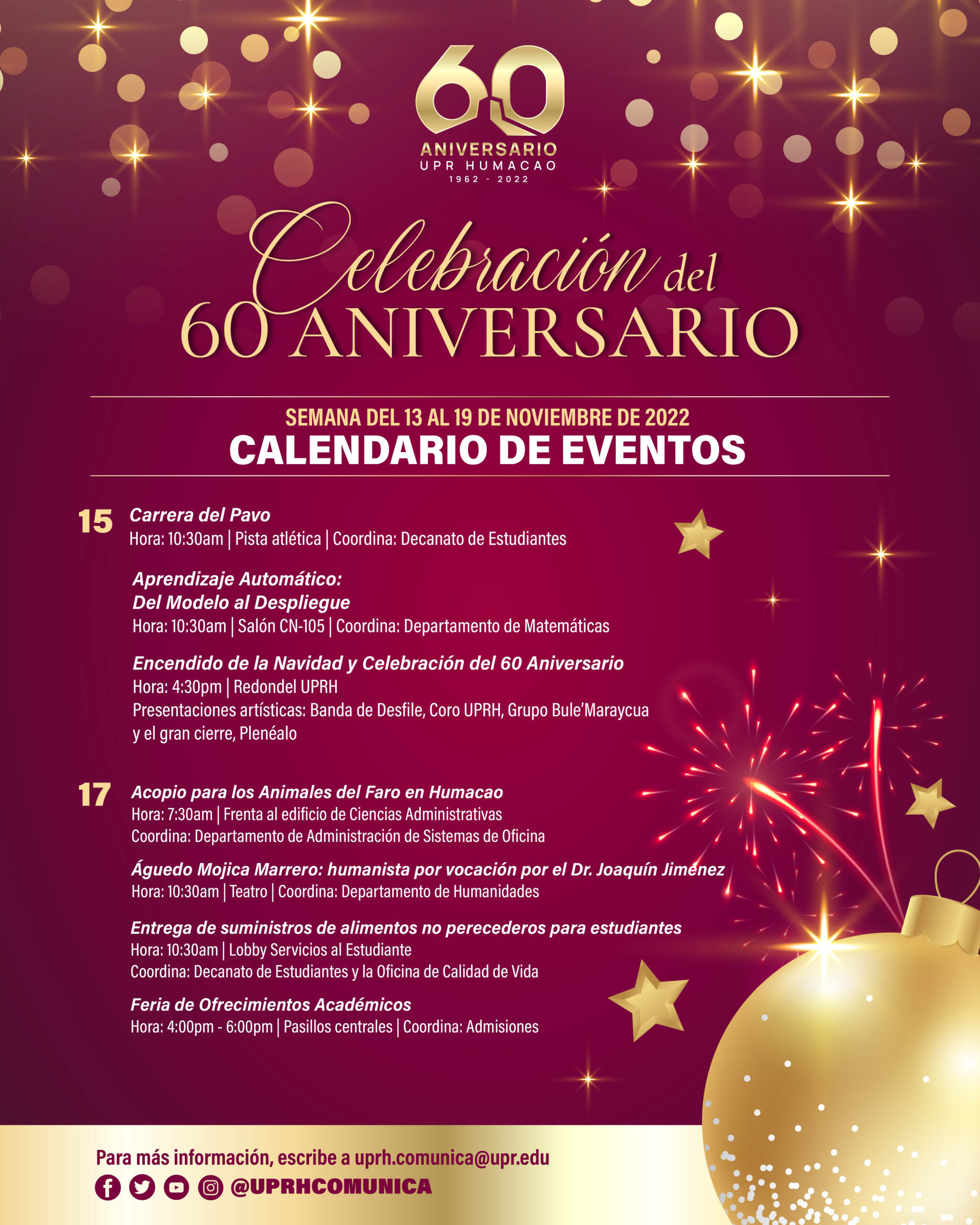 Las actividades son libres de costo y para el público general. Para ver el calendario de eventos, acceda https://www.upr.edu/ac/humacao/celebracion-del-60-aniversario-de-la-uprh/