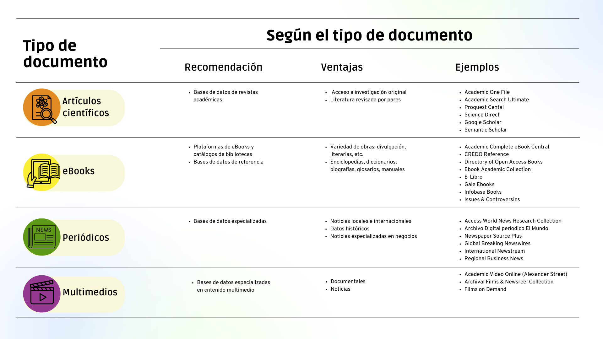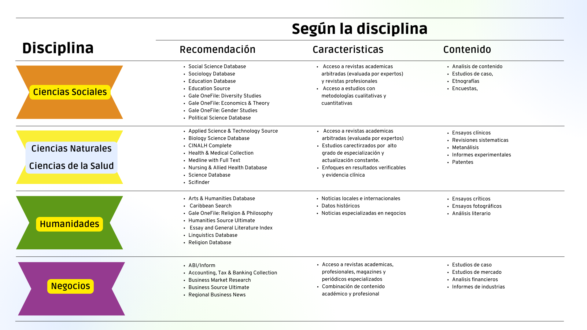 - Ejemplos:Academic Source Ultimate, Proquest Central, ScienceDirect, Fuente Académica