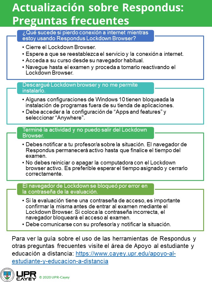 En aras de contribuir a una implementación exitosa del Respondus Lockdown browser en los cursos, periódicamente les estaré enviando recomendaciones a base de las experiencias tanto de los estudiantes como la facultad en el uso de la herramienta. Comparto con ustedes algunas recomendaciones para esta semana: