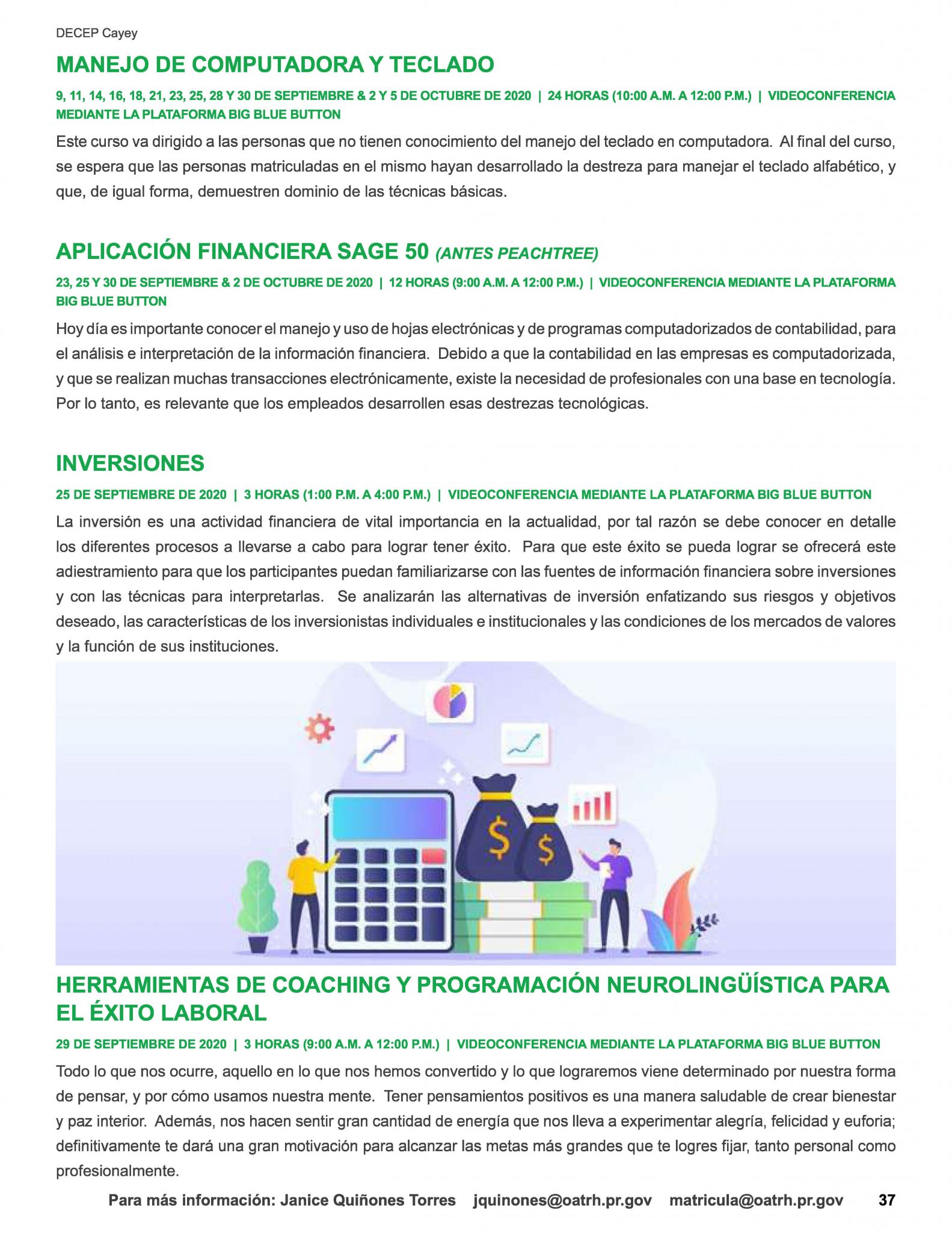 La División de Educación Continua y Estudios Profesionales de la Universidad de Puerto Rico en Cayey con el fin de desarrollar y fortalecer el conocimiento de los servidores públicos de Puerto Rico le ofrece cursos cortos y adiestramientos. Para más información sobre los cursos pueden entrar al enlace o comunicarse a nuestra oficina al (787) 738-4445 o al (787) 738-2161 ext. 2031 o 2067.