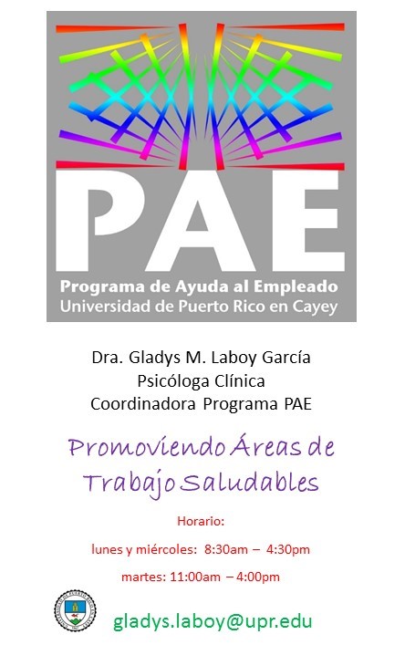 El Programa de Ayuda al Empleado/a (PAE) de la Universidad de Puerto Rico en Cayey, busca prevenir, identificar y atender una variedad de situaciones que pueden provocar problemas ocupacionales. Por lo tanto, sus servicios están dirigidos a servir no solamente a aquellos empleados que presentan problemas de ejecución, sino también al resto de la fuerza laboral, a supervisores/as y el resto del personal docente y no docente. Así mismo interesa canalizar y coordinar el uso adecuado de los recursos. Su enfoque preventivo pretende crear un ambiente de trabajo positivo que promueva el bienestar de todos, y por lo tanto, estimule la productividad.