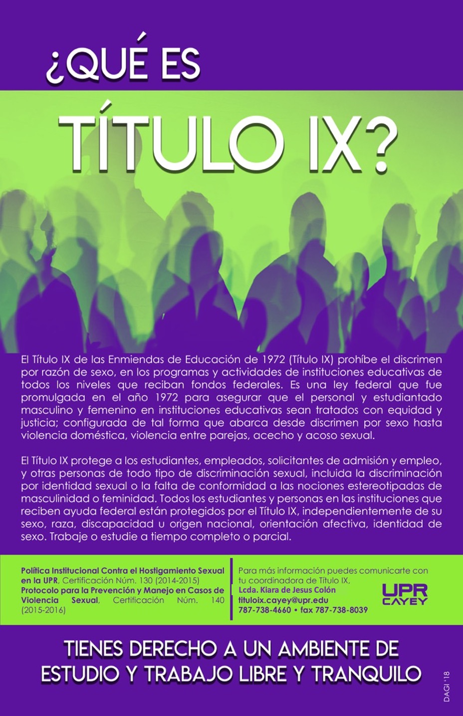 El Título IX de las Enmiendas de Educación de 1972 es una ley federal que prohíbe la discriminación basada en género o sexo en cualquier programa o actividad educativa, protege a estudiantes, personal docente y no docente. El discrimen por sexo puede incluir hostigamiento sexual, acecho, violencia doméstica, violencia entre parejas o agresión sexual.