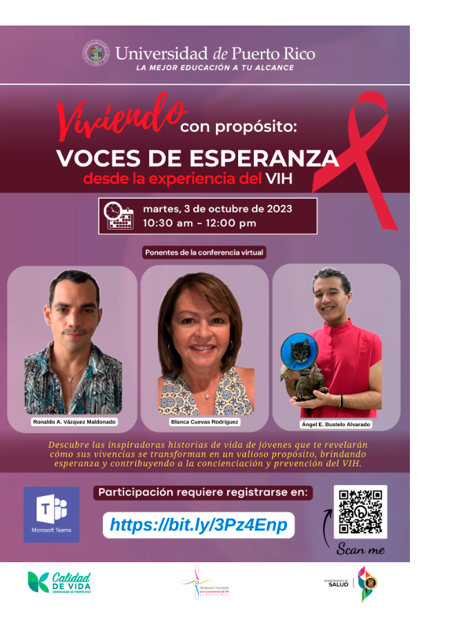 La campaña se inicia con la conferencia virtual Viviendo con Propósito: Voces de Esperanza desde la Experiencia del VIH, que tendrá lugar el martes, 3 de octubre de 2023. En este evento, dos jóvenes diagnosticados con VIH compartirán sus historias, resaltando cómo la condición se convirtió en una oportunidad para promover la concienciación y la prevención del VIH. Ronaldo Andrés Vázquez Maldonado, promotor de la salud en la División de Prevención de ETS/VIH/HV/TB del Departamento de Salud y Ángel E. Bustelo Alvarado, médico veterinario, representan a la juventud que logra superar las adversidades para continuar con su propósito de vida. Estos testimonios inspiradores son el corazón de la campaña.