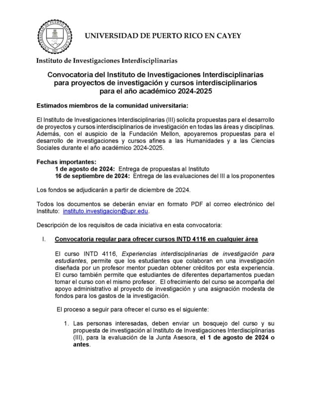Fechas importantes: 29 de mayo de 2024: orientación sobre esta convocatoria en el Instituto 1 de agosto de 2024: entrega de propuestas al Instituto