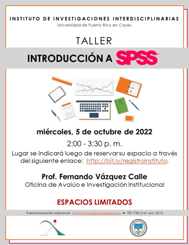 DetailsTaller para facultad y estudiantes de UPR-Cayey: Introducción a SPSS Modalidad: presencial Espacios limitados: http://bit.ly/registroinstituto