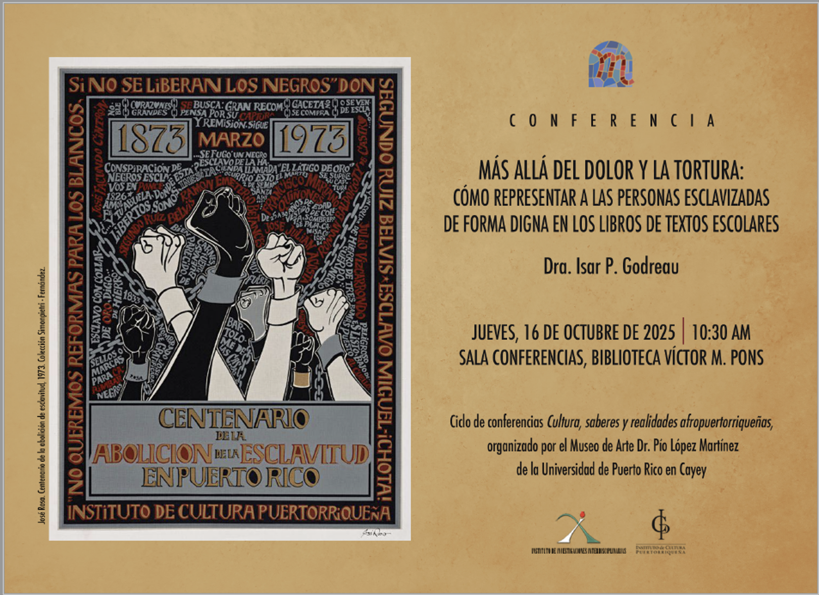 Más allá del dolor y la tortura: Cómo representar a las pesonas eclavizadas de forma digna en los libros de textos escolares 16 de octubre de 2025, Biblioteca UPR Cayey