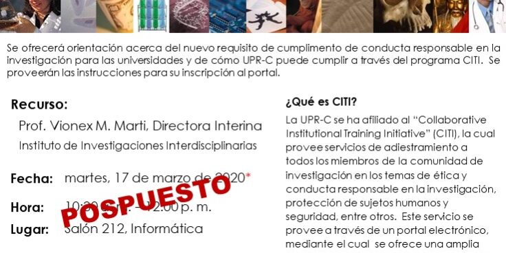 Debido al anuncio de cancelación de clases presenciales en la UPR en la semana del 16 al 23 de marzo de 2020, esta actividad se pospone hasta nuevo aviso.
