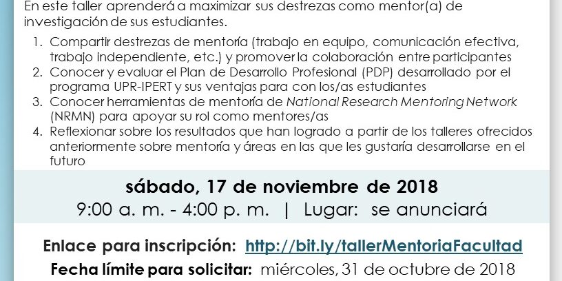 Oct32018Actividades Enlace para inscripción: http://bit.ly/tallerMentoriaFacultad Fecha límite para solicitar: miércoles, 31 de octubre de 2018 Category: ActividadesBy Francisco Camachooctubre 3, 2018 Author: Francisco Camacho Post navigationPreviousPrevious post:Taller para facultad: CITINextNext post:Programa de seminarios y talleres (agosto-diciembre 2018)Related postsPresentacionesdiciembre 4, 2025Panelnoviembre 12, 202525 Aniversariooctubre 22, 2025Conferenciaoctubre 9, 2025Conferenciaoctubre 2, 2025Conferenciaseptiembre 26, 2025