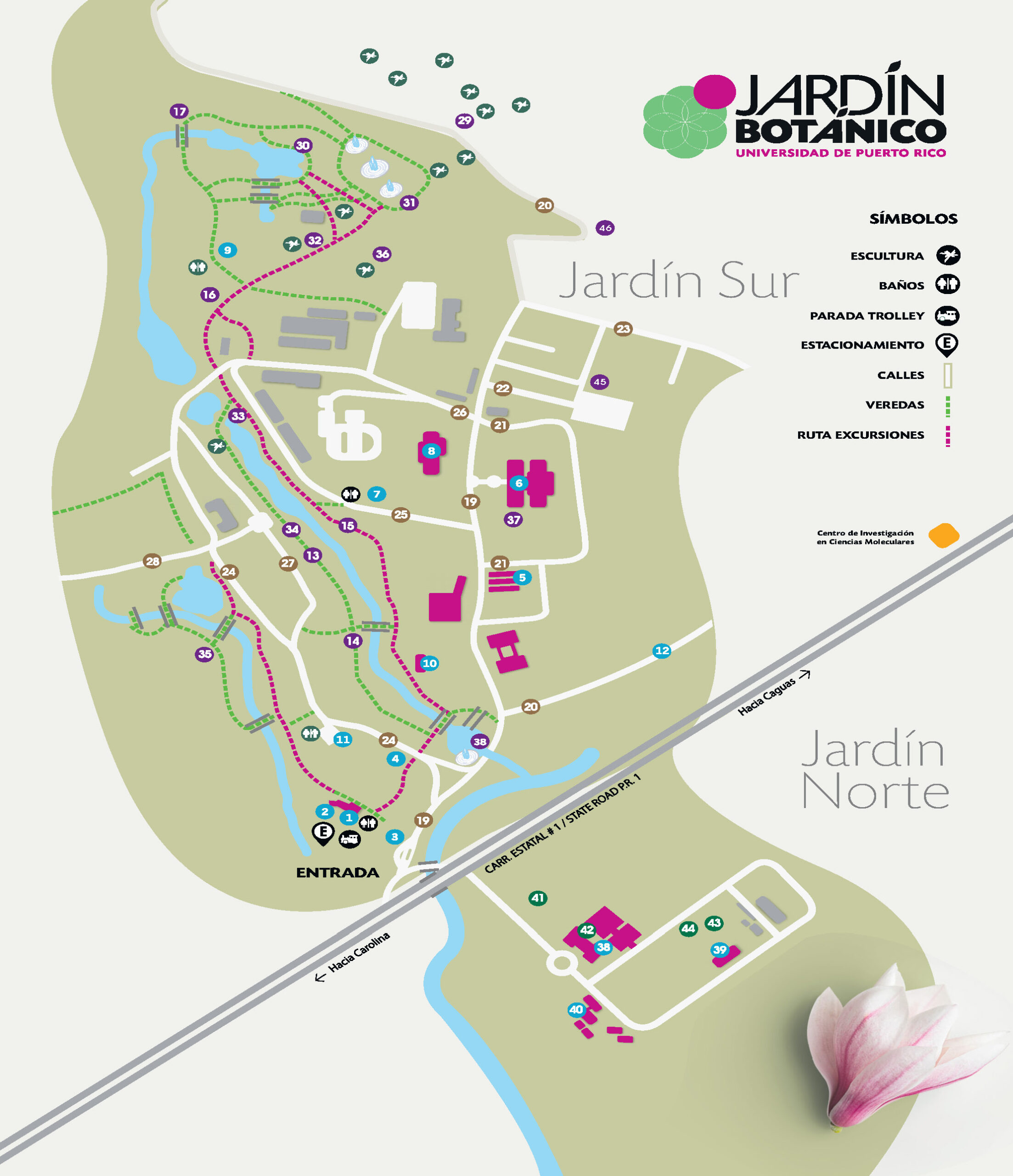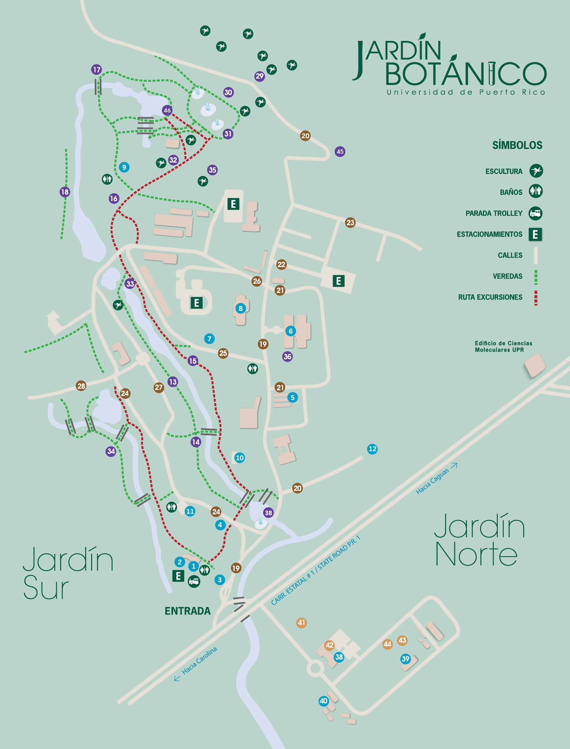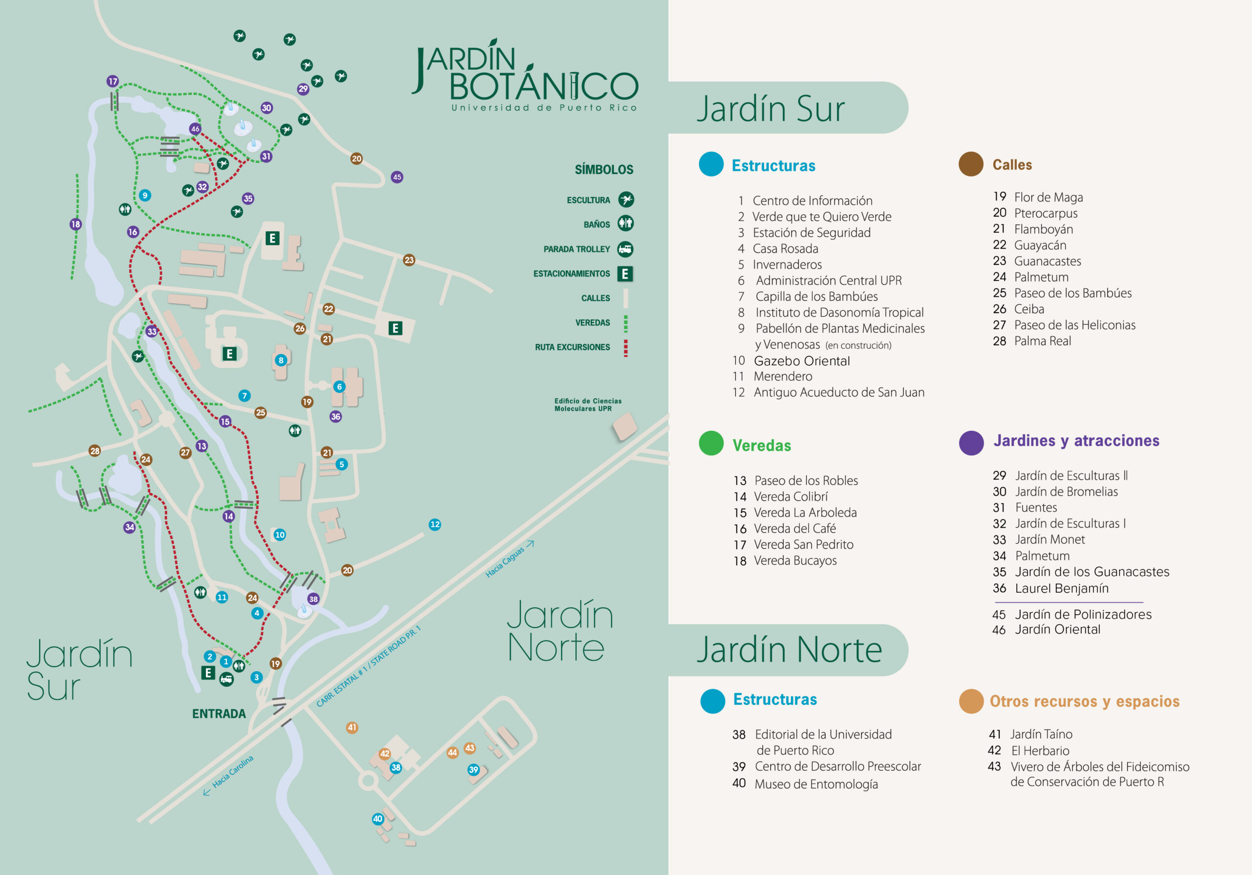 El Jardín se divide en dos partes por la carretera PR-1: el Jardín Botánico Norte y el Jardín Botánico Sur. La mayor parte de las atracciones para visitantes se encuentran en el Jardín Botánico Sur.