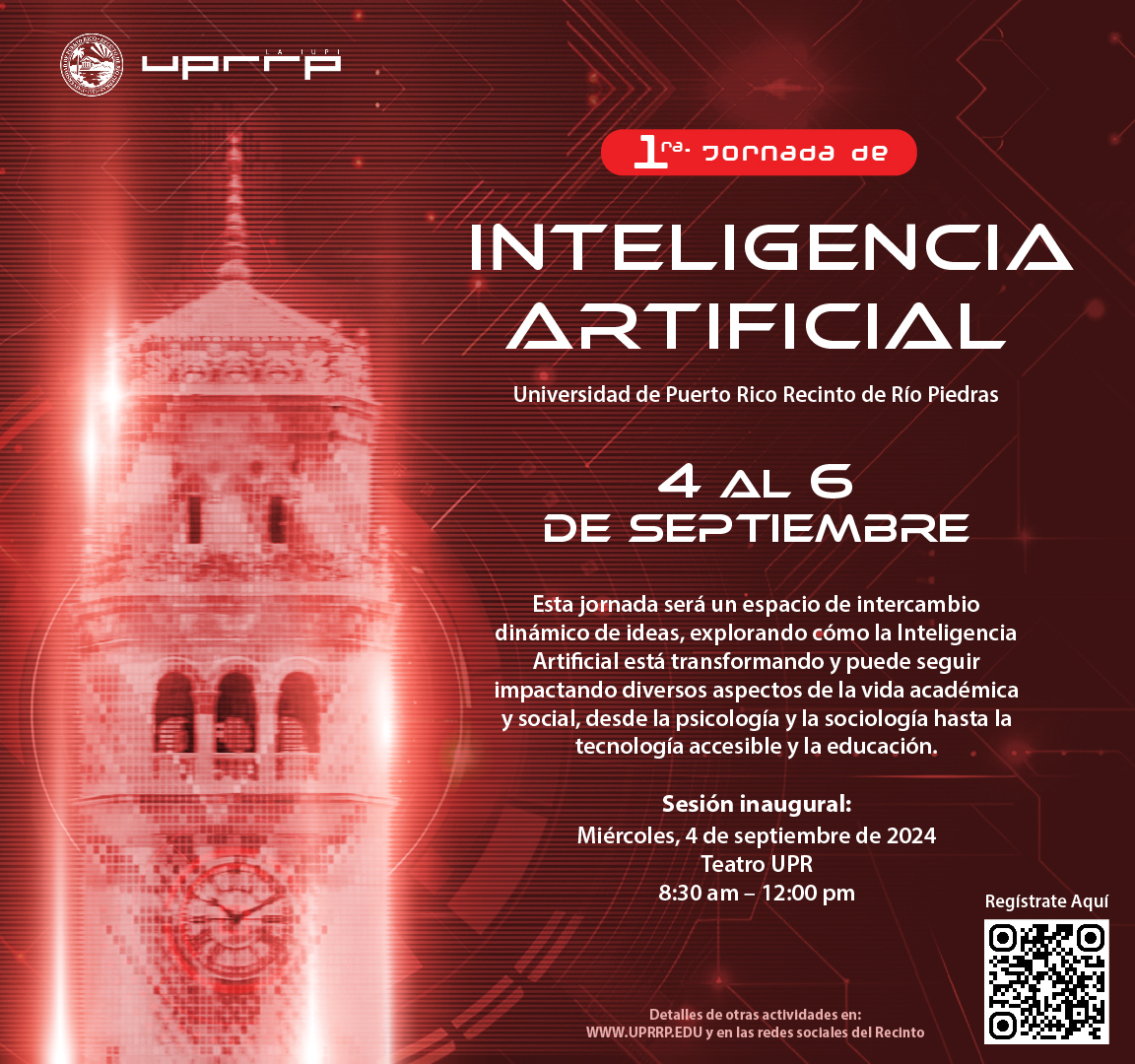 El Recinto de Río Piedras de la Universidad de Puerto Rico (UPR) llevará a cabo su Primera Jornada sobre Inteligencia Artificial (IA) del 4 al 6 de septiembre de 2024.