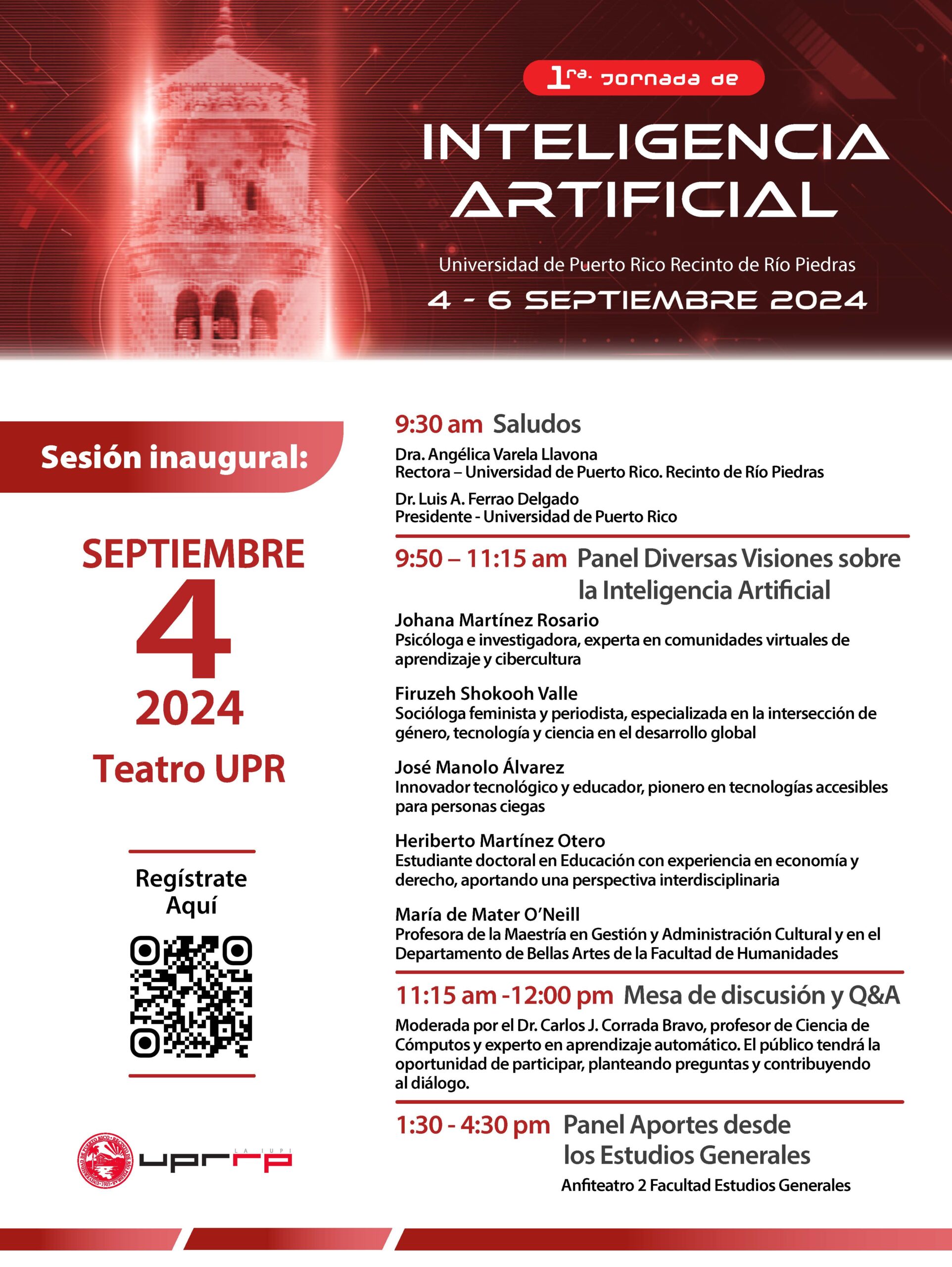 La jornada, abierta al público en general y gratuita, dará inicio el miércoles, 4 de septiembre, a partir de las 9:30 a.m., en el Teatro de la UPR, con la presentación del panel Diversas visiones sobre la inteligencia artificial. El panel está compuesto por la psicóloga e investigadora Johana Martínez Rosario; la socióloga y periodista Firuzeh Shokooh Valle; el educador José Manolo Álvarez; el estudiante doctoral en Educación Heriberto Martínez Otero y la artista y profesora en gestión y administración cultural, María Mater O’Neill, y será moderado por el Dr. Carlos Corrada Bravo, catedrático de Ciencia de Cómputos y decano de la Facultad de Ciencias Naturales.