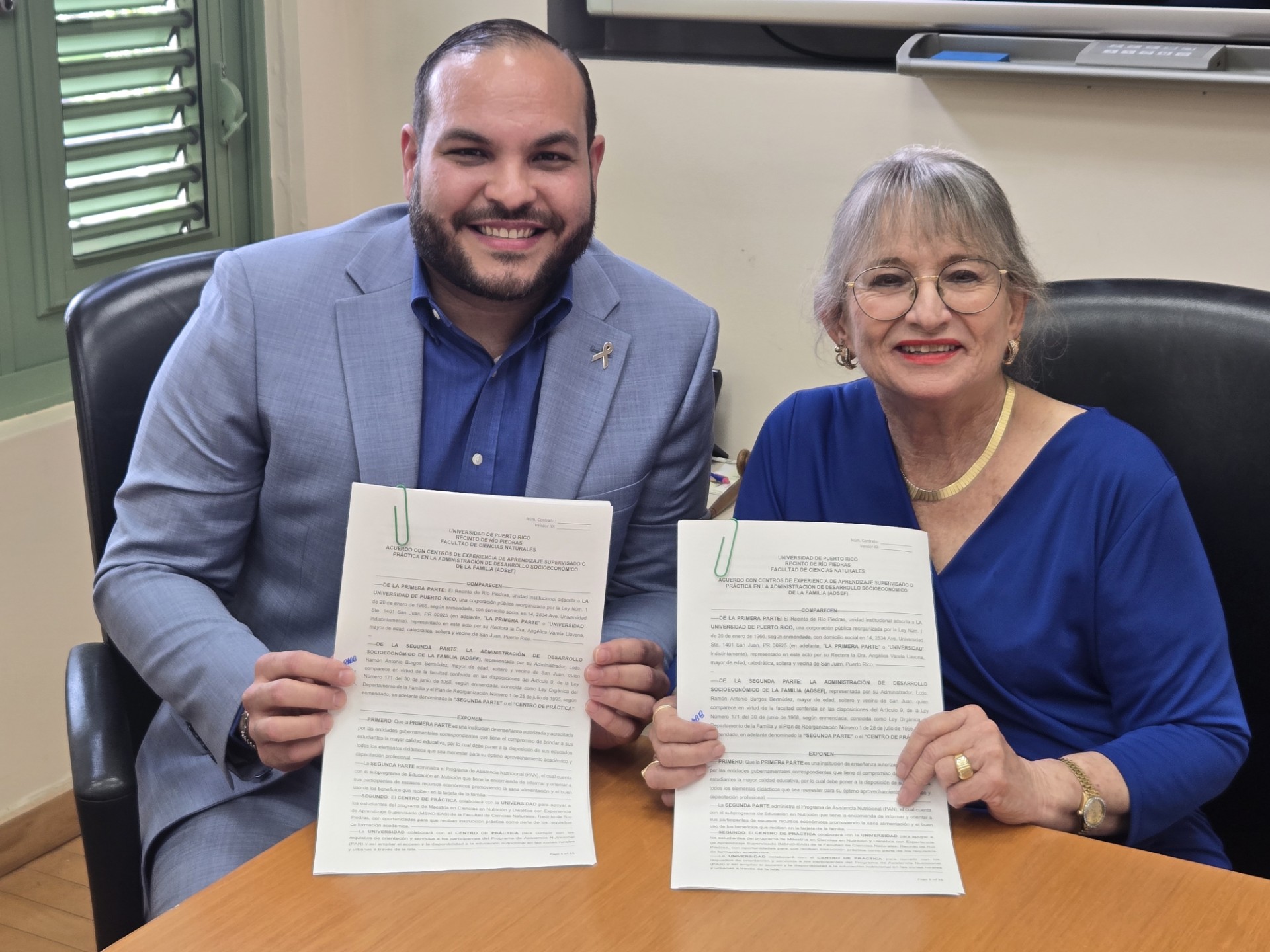 El Recinto de Río Piedras de la Universidad de Puerto Rico (UPRRP) y la Administración de Desarrollo Socioeconómico de la Familia (ADSEF) firmaron recientemente un acuerdo de colaboración que beneficiará directamente a la comunidad estudiantil del Programa de Maestría en Ciencias en Nutrición y Dietética con Experiencia en Aprendizaje Supervisado (MSND-EAS), adscrito a la Facultad de Ciencias Naturales.