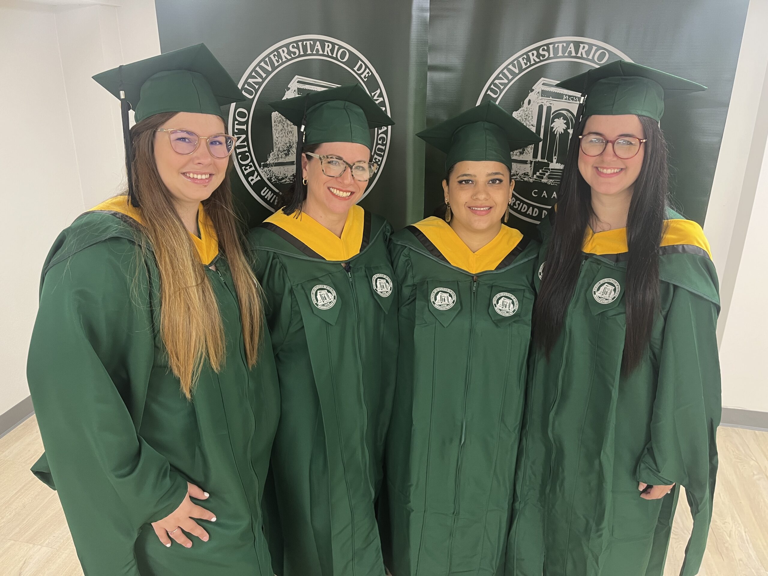 Los pioneros graduandos del mencionado programa que inició en el 2020 en el RUM son: Brenda M. Cintrón Rodríguez, Krystal Colón Rivera, Yan Lee Feng Ruiz, Lina M. Morales Bernal, Mónica Desireé Ruiz Ruiz, Maryliz Soto Quiles, Mariely Vélez Pérez y Angélica Cristina Zayas Alicea. Todos continuarán su jornada hacia el doctorado.