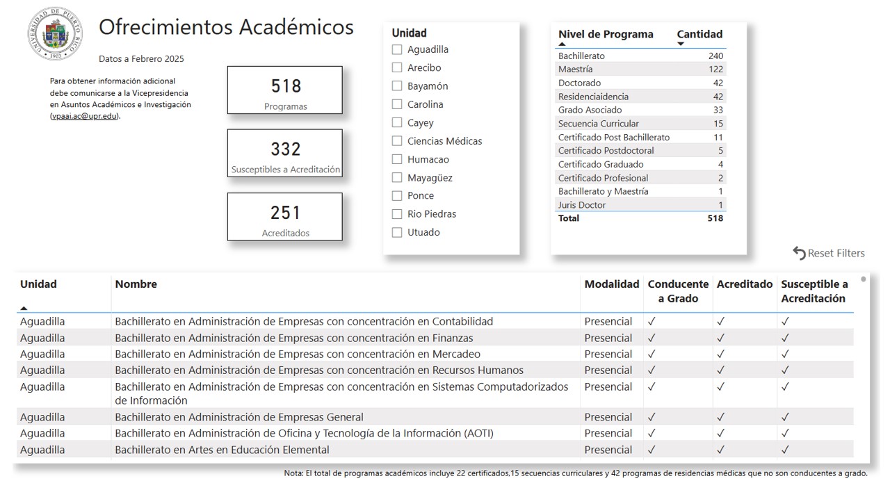 La Universidad de Puerto Rico está acreditada por la Middle States Commission on Higher Education, (MSCHE) (https://www.msche.org/) desde 1946. Al 2023, cada una de las once Unidades del Sistema está acreditada. El proceso de acreditación institucional es uno voluntario y riguroso, que define, mantiene y promueve la excelencia académica y el mejoramiento continuo de la institución. La acreditación permite que los estudiantes tengan acceso a las ayudas económicas federales. A su vez, los créditos universitarios cualifican para ser transferidos a otras universidades acreditadas a nivel mundial. Además, el grado obtenido por un estudiante en una institución acreditada posee un valor incalculable a la hora de solicitar empleo y estudios graduados.