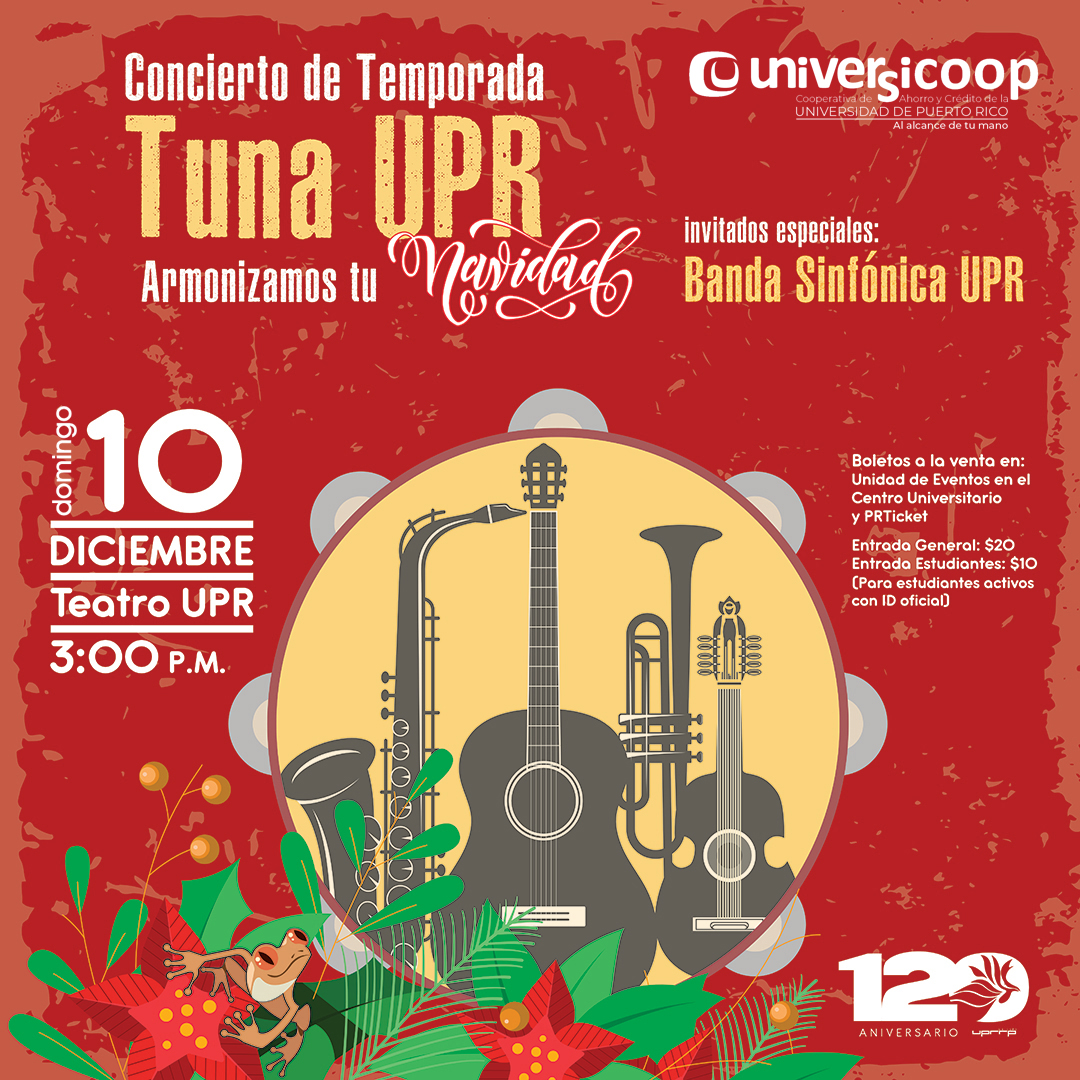 La Tuna de la Universidad de Puerto Rico (UPR) presentará su concierto de temporada “Armonizamos tu Navidad”, el domingo, 10 de diciembre de 2023, a las 3:00 p.m., en el Teatro UPR en el Recinto de Río Piedras.