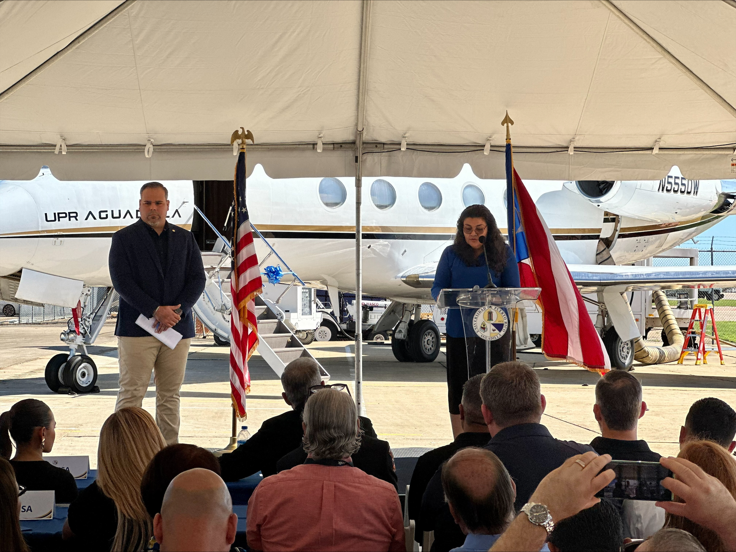 Dra. Sonia Rivera Gonzalez, rectora de la UPR Aguadilla, durante la conferencia de prensa celebrada en las afueras del Instituto de Aeronautica y Aeroespacial de Puerto RicoEl Dr. Luis A. Ferrao Delgado, presidente de la UPR, destacó: “Este esfuerzo conjunto no solo fortalece la educación y capacitación de nuestros estudiantes en el campo aeronáutico, sino que posiciona a la Universidad de Puerto Rico, Recinto de Aguadilla, como un pilar fundamental en el desarrollo de un ecosistema académico aeronáutico de clase mundial, asegurando que nuestros egresados estén preparados para los desafíos del sector aeroespacial global”.