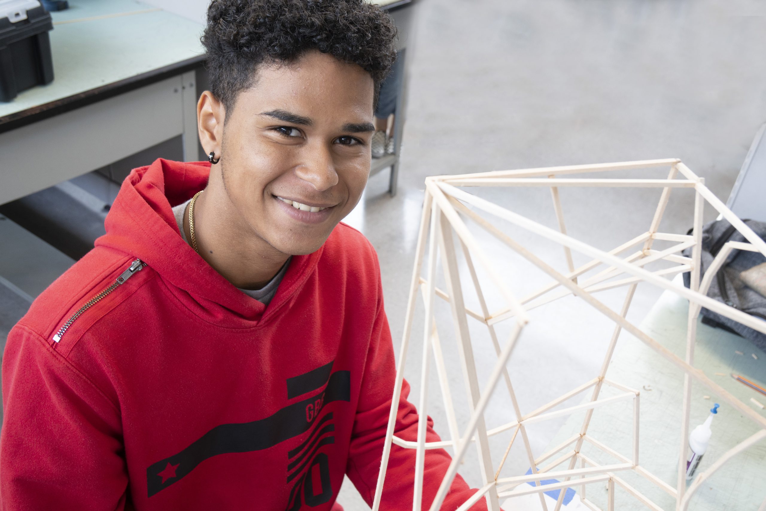 Foto de estudiante sosteniendo un modelo de arquitectura.