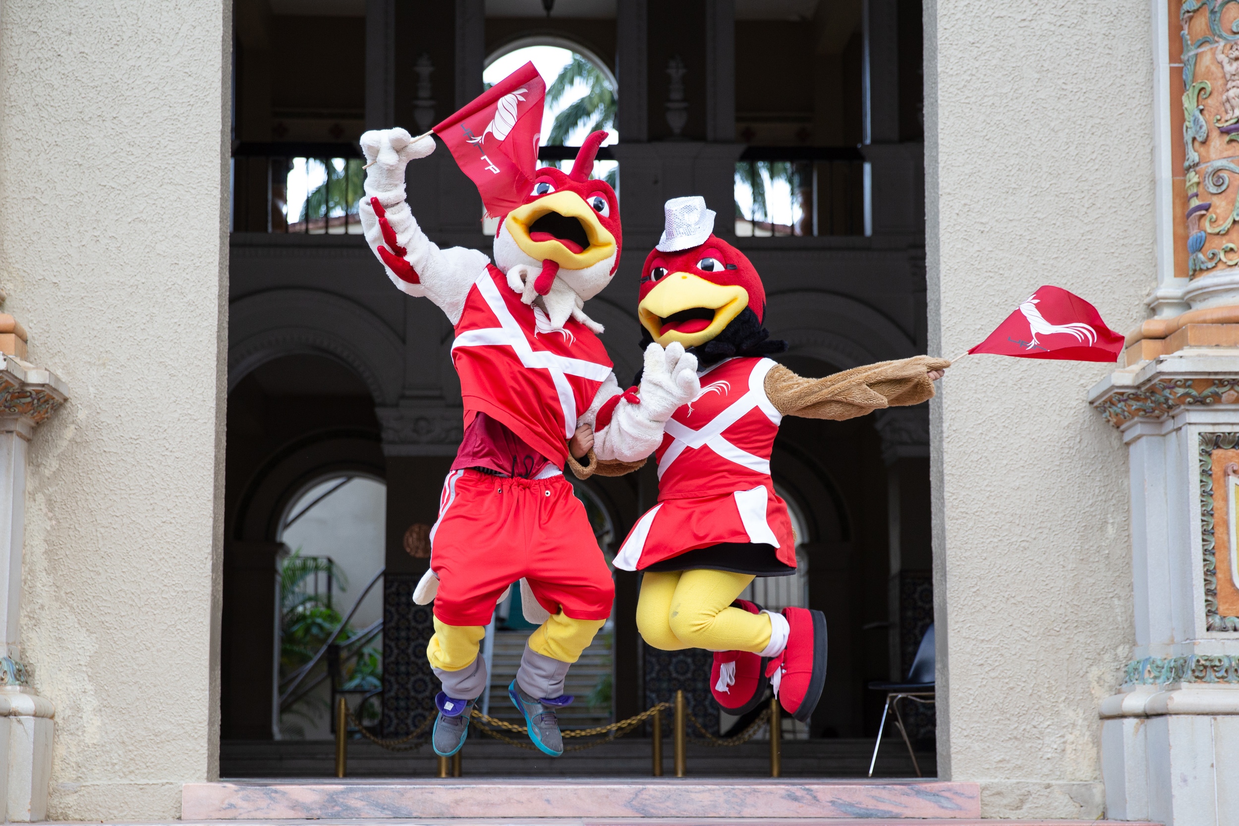 Mascotas de la U.P.R. Río Piedras. El Gallo y la gallina jerezana con banderines en mano, saltando frente a la entrada principal de la Torre de la U.P.R.