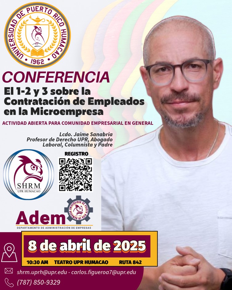 (Humacao, P.R.) – El Departamento de Administración de Empresas de la Universidad de Puerto Rico en Humacao (UPRH) les invita al evento El 1-2-3 de la Contratación de Empleados en Microempresas, que se llevará a cabo el martes, 8 de abril de 2025, a las 10:30 a.m. en el Teatro de la institución.